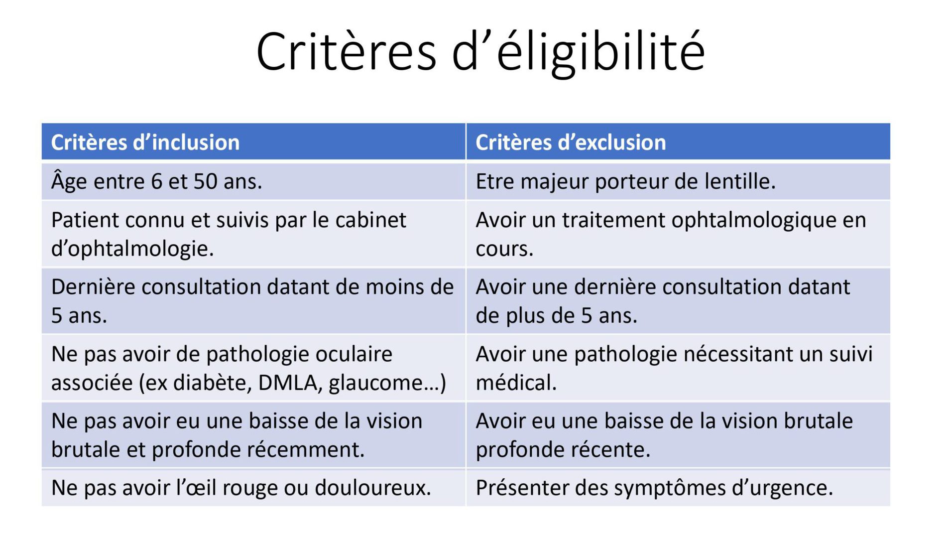 Si vous avez des antécédents de maladie ophtalmologique ou générale, merci d’apporter vos courriers d’examens médicaux ainsi que la liste à jour de vos traitements oculaires et généraux.